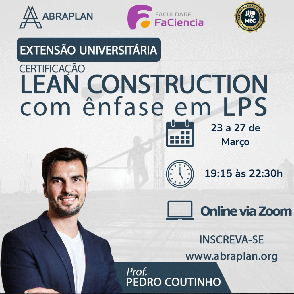 O Curso de Lean Construction da ABRAPLAN apresenta uma abordagem prática e aplicada dos princípios Lean voltados à construção civil, ajudando profissionais a otimizar processos, melhorar a qualidade e aumentar a previsibilidade dos resultados.